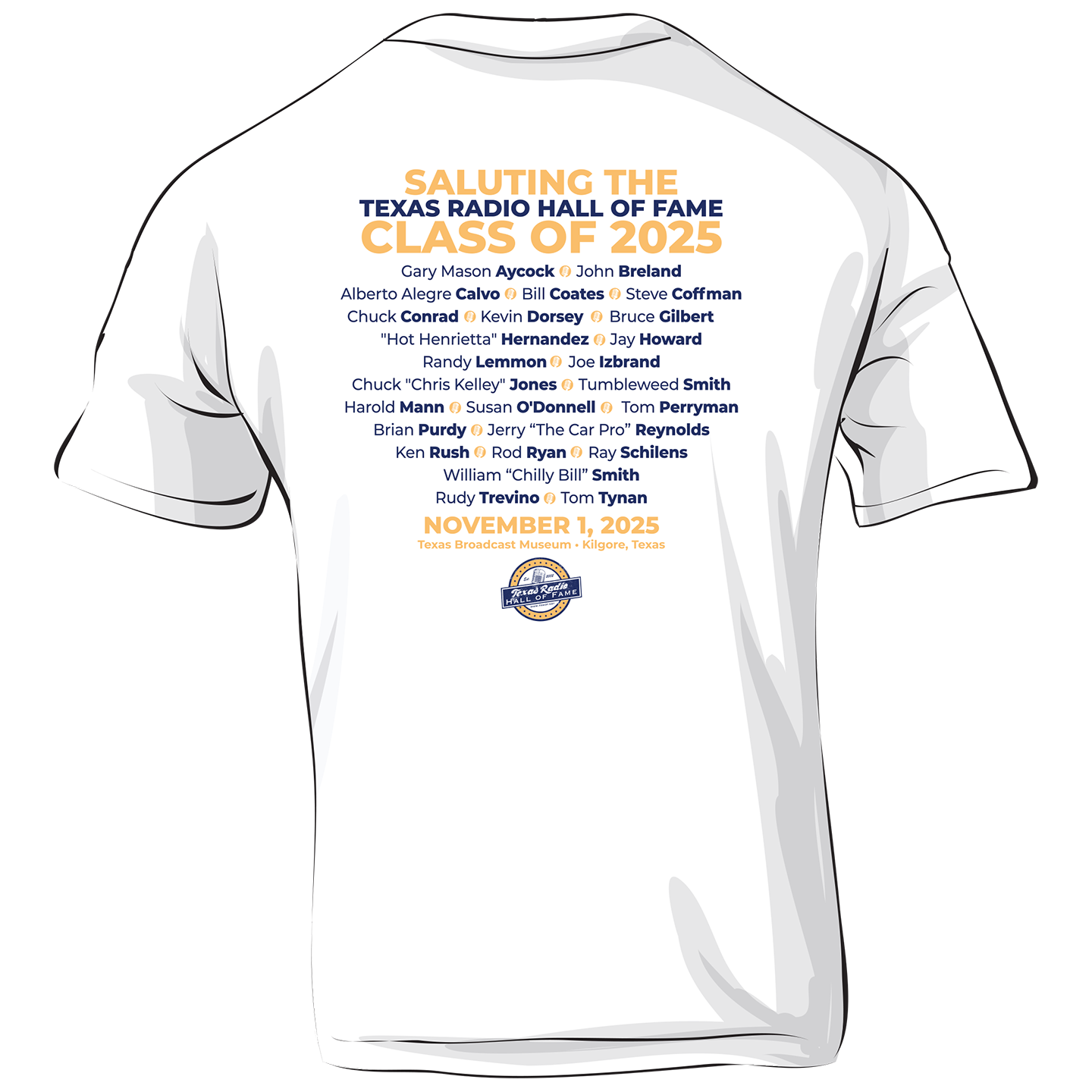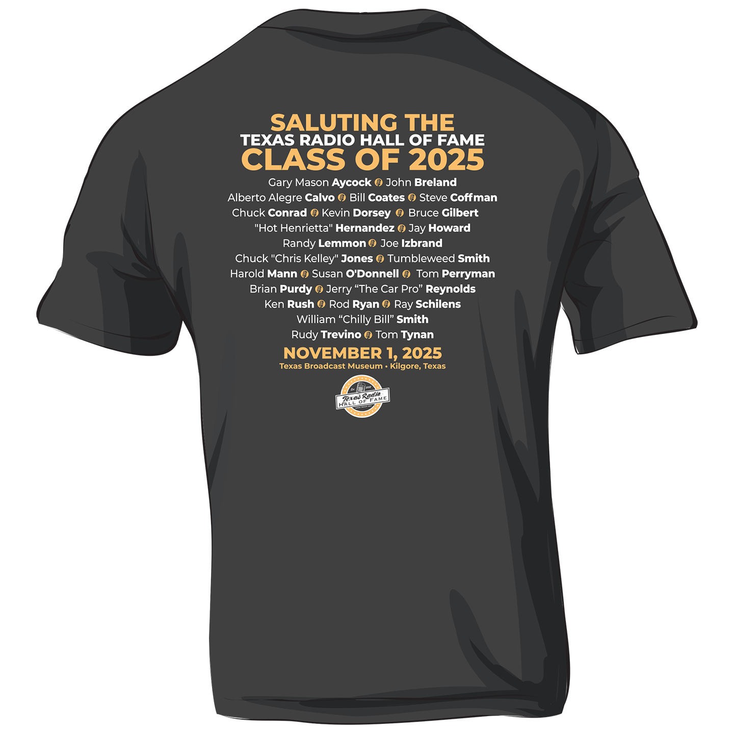 The event t-shirt, which is available in black or white and features the names of all 2025 inductees on the back and the full color TRHOF logo on the front, is available through FavoriteRadioShirts.com. Those who order t-shirts in advance of October 10th may pick them up at the Induction Ceremony on November 1st. These will also be available for sale in limited quantities on the day of the event.